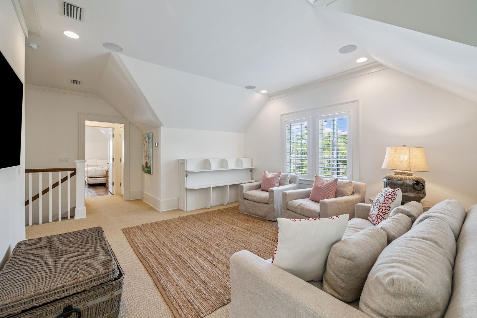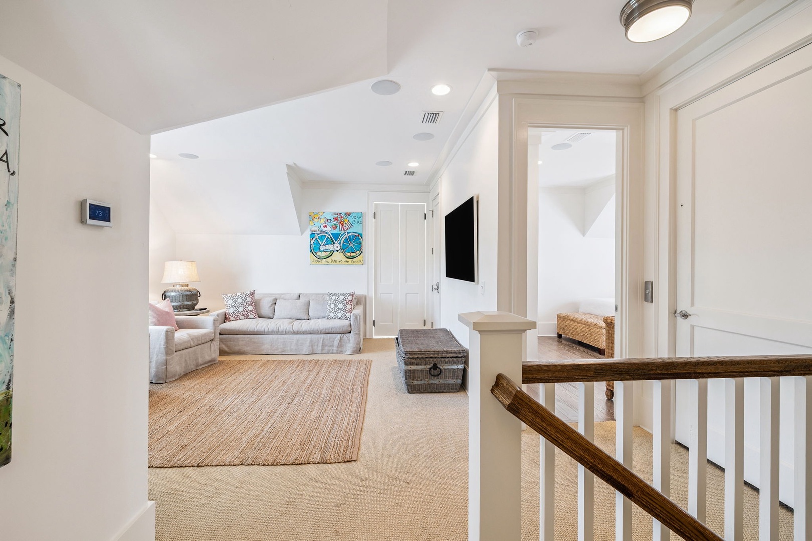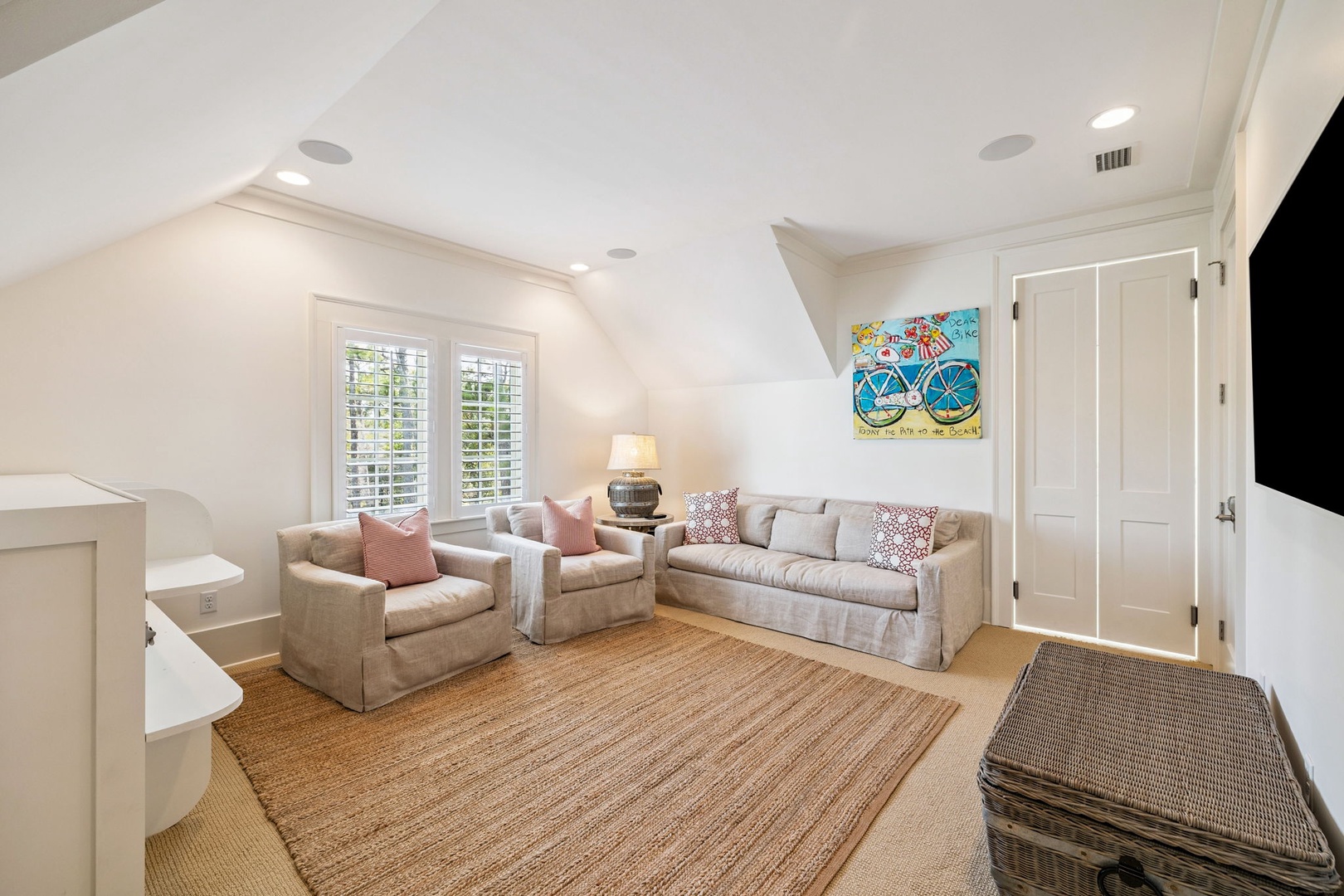 The Third level living area offers an additional space for guests to hang out, furnished with a sofa, two armchairs, and a TV. Sleeping arrangements include a guest bedroom with two twin trundles and a twin Murphy bed in the living space, making it ideal for families or groups.