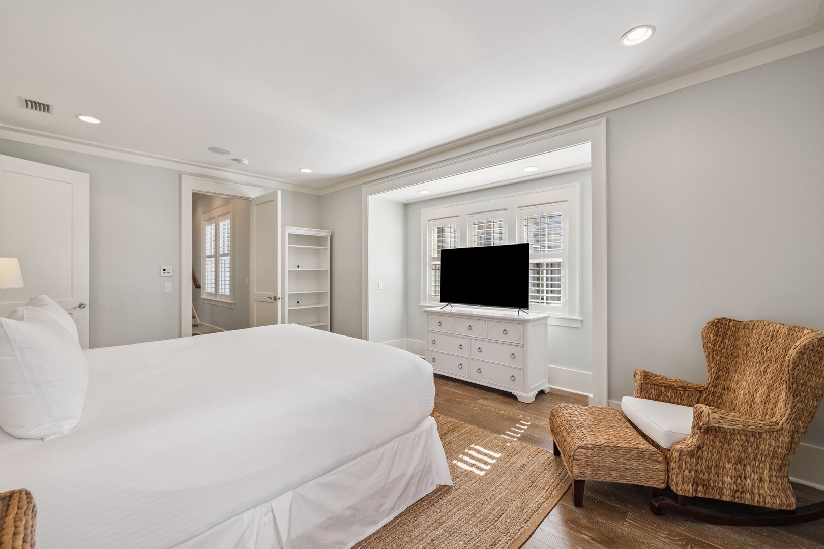 The second level hosts the primary bedroom with a king bed and two guest bedrooms with queen beds. Each bedroom features a private bathroom and a smart TV for added convenience. The two guest bedrooms share a balcony equipped with a cushioned porch swing, perfect for relaxing outdoors. An office is located next to the primary bedroom, providing a quiet space to work or read.