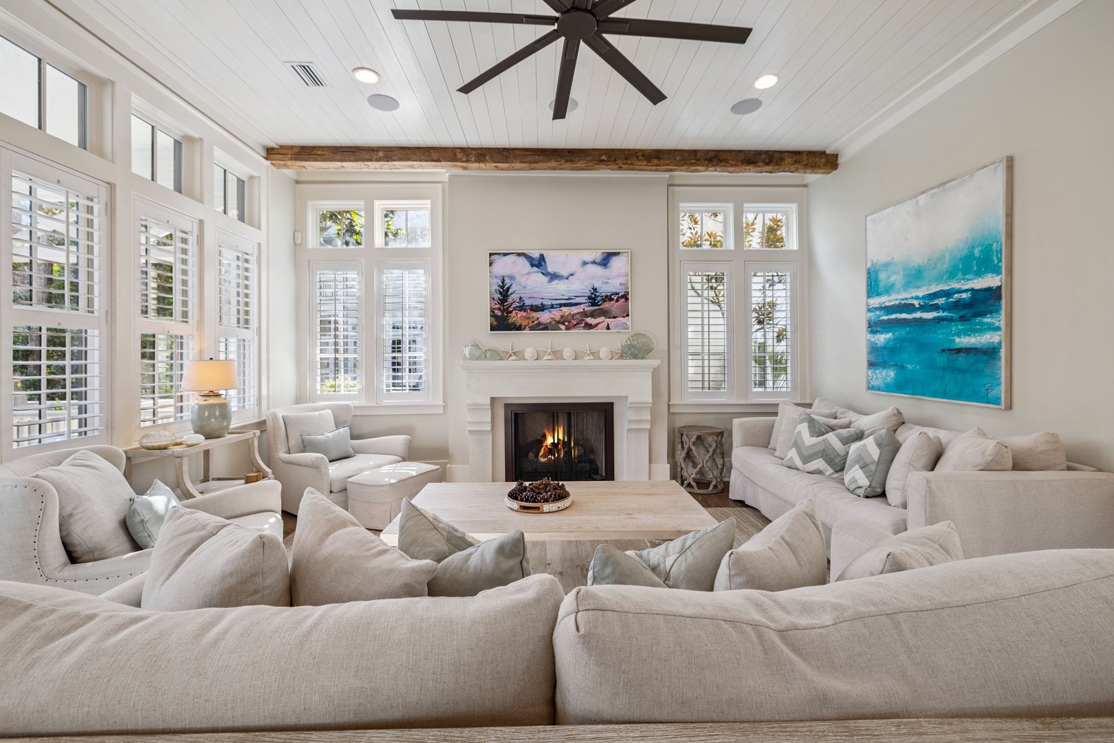 Step into a refined and peaceful interior highlighted by tongue and groove beamed ceilings, hardwood floors, and natural fiber rugs. The living area is furnished with two plush sofas and matching armchairs, perfect for unwinding with a movie or your favorite sporting event on the 65-inch smart TV. The gourmet kitchen invites family cooking sessions and is adjacent to a large dining table for eight and a dry bar. A walk-in laundry room with washer and dryer is located just off the kitchen. Enjoy the fresh air on the screened porch, which features a sitting area, fireplace, TV, and overhead fan. Outside, relax on comfortable shaded patio furniture or dine at the six-seat outdoor table. The private pool and sitting spa offer additional enjoyment.